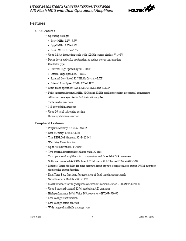 - Up to 0.33μs instruction cycle with 12MHz system clock at VDD=5V