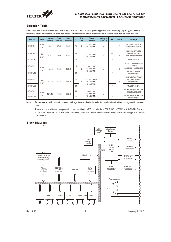 The HT68FXX series of devices are Flash Memory I/O type 8-bit high performance RISC architecture microcontrollers. Offering users the convenience of Flash Memory multi-programming.