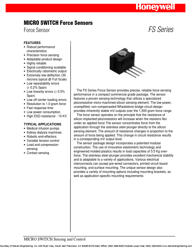 The FS Series Force Sensor provides precise, reliable force sensing performance in a pact mercial grade package. The sensor features a proven sensing technology that utilizes a specialized piezoresistive micro-machined silicon sensing element. The low power, unamplified, non-pensated Wheatstone bridge circuit design provides inherently stable m V outputs over the 1,500 gram force range.