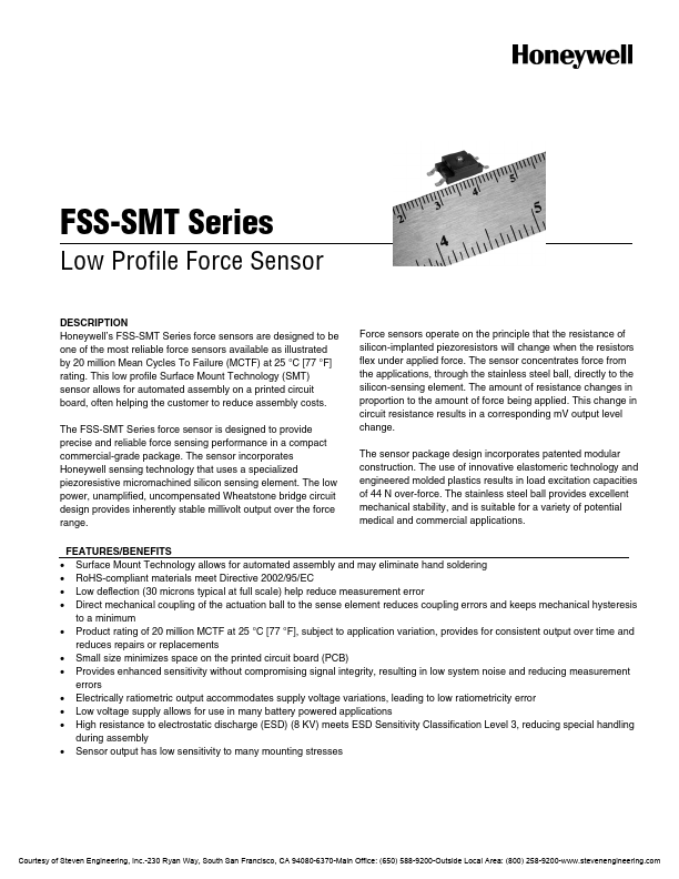The FSS-SMT Series force sensor is designed to provide precise and reliable force sensing performance in a pact mercial-grade package. The sensor incorporates Honeywell sensing technology that uses a specialized piezoresistive micromachined silicon sensing element. The low power, unamplified, unpensated Wheatstone bridge circuit design provides inherently stable millivolt output over the force range.