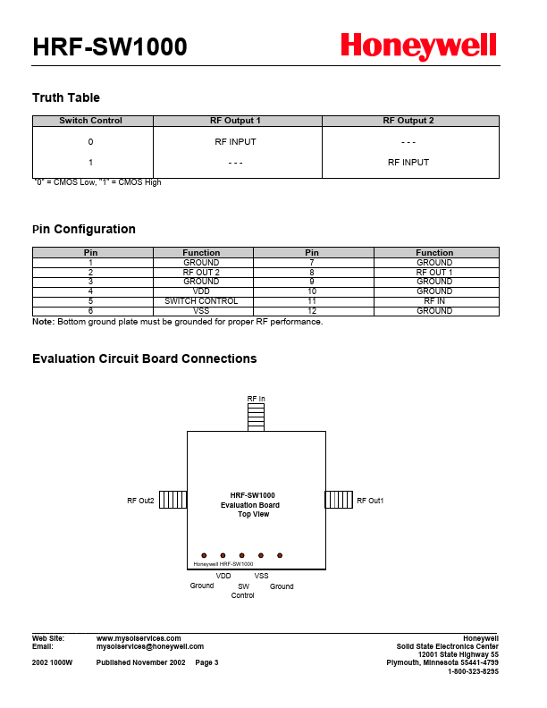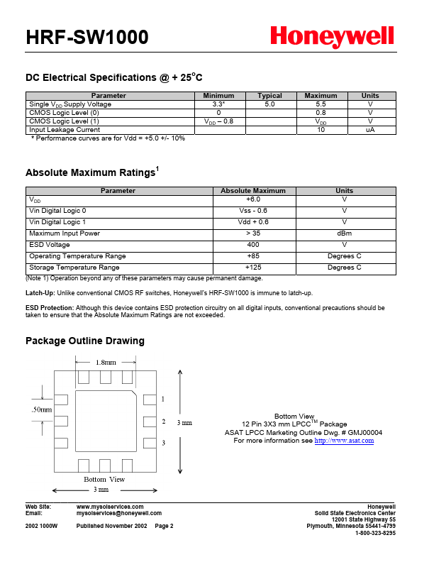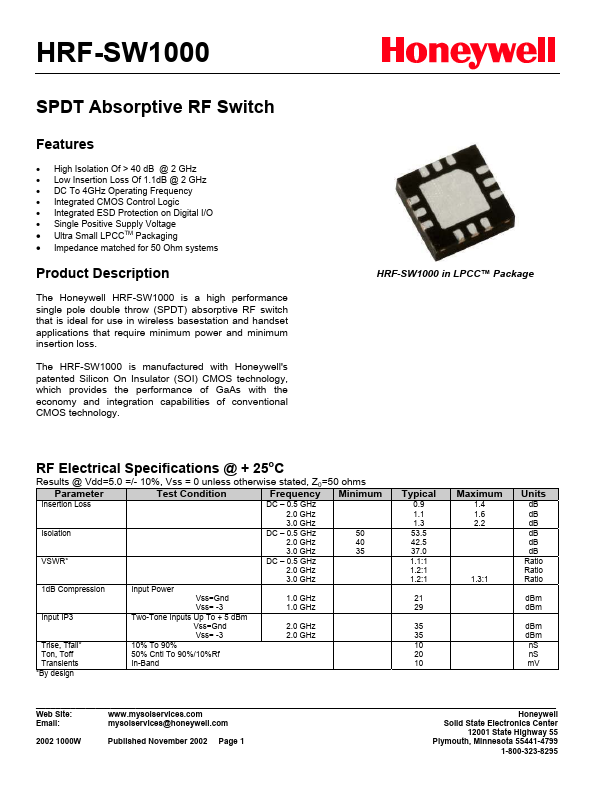 The Honeywell HRF-SW1000 is a high performance single pole double throw (SPDT) absorptive RF switch that is ideal for use in wireless basestation and handset applications that require minimum power and minimum insertion loss.