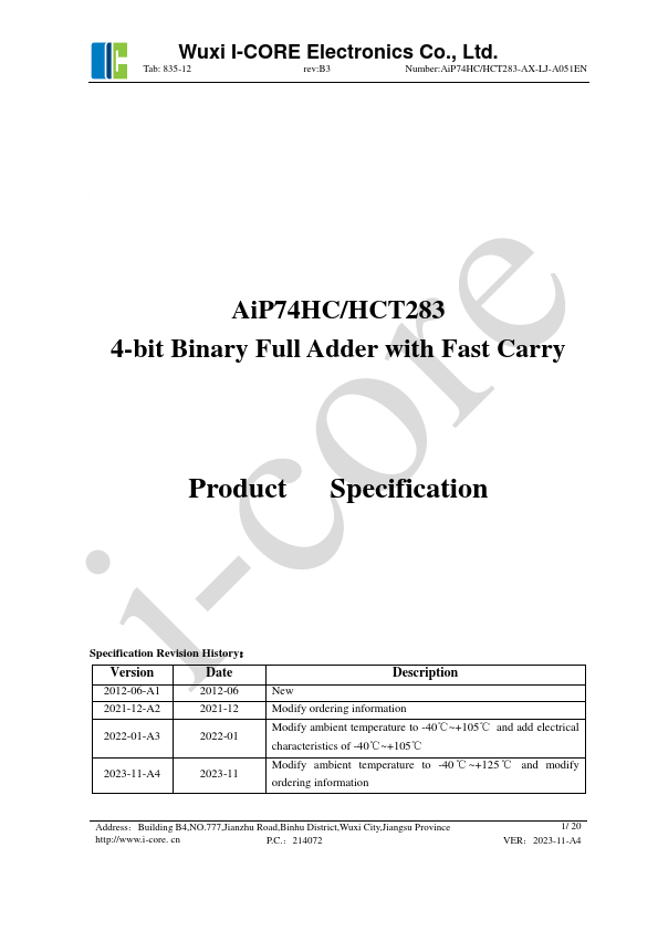 2012-06-A1 2012-06 New 2021-12-A2 2021-12 Modify 2022-01-A3 2022-01 Modify ambient temperature to -40℃~+105℃ and add 2023-11-A4 2023-11 Modify ambient temperature to -40 ℃ ~+125 ℃ and modify Address:Building B4,NO.777,Jianzhu Road,Binhu District,Wuxi City,Jiangsu Province http://www.i-core. cn P.C.:214072 1/ 20 VER:2023-11-A4 Wuxi I-CORE Electronics Co., Ltd.
