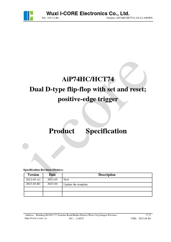 2012-05-A1 2012-05 New 2023-04-B1 2023-04 Update the template Address:Building B4,NO.777,Jianzhu Road,Binhu District,Wuxi City,Jiangsu Province http://www.i-core. cn P.C.:214072 1/ 21 VER:2023-04-B1 Wuxi I-CORE Electronics Co., Ltd.