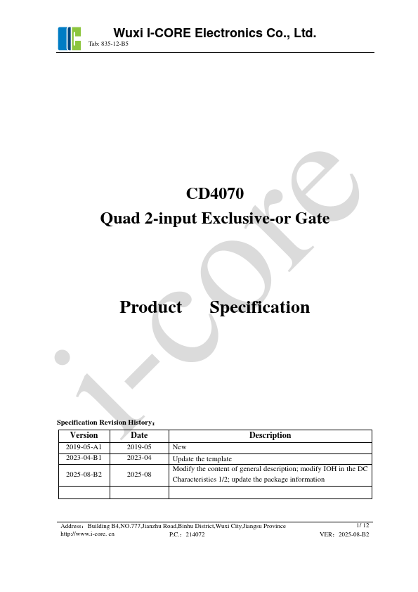 2019-05-A1 2019-05 New 2023-04-B1 2023-04 Update the template 2025-08-B2 2025-08 Modify the content of general description; modify IOH in the DC Characteristics 1/2; update the package information Address:Building B4,NO.777,Jianzhu Road,Binhu District,Wuxi City,Jiangsu Province http://www.i-core. cn P.C.:214072 1/ 12 VER:2025-08-B2 Wuxi I-CORE Electronics Co., Ltd.