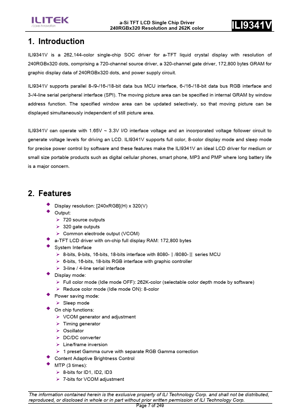 ILI9341V a-Si TFT LCD Single Chip Driver 240RGBx320 Resolution and 262K color Datasheet Version: ILI9341V_DTS_V100_20130423 ILI TECHNOLOGY CORP. 38, Taiyuan St., Jhubei City, Hsinchu Country 302 Taiwan R.O.C.