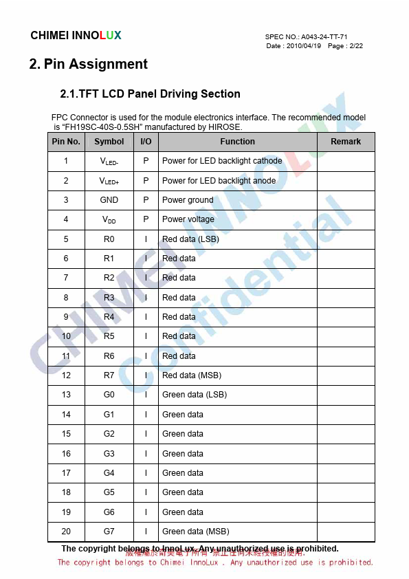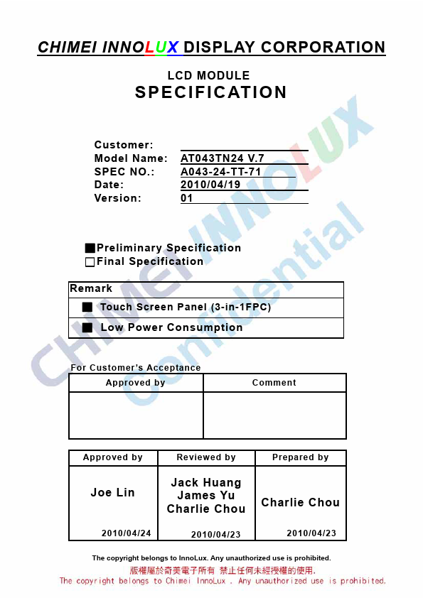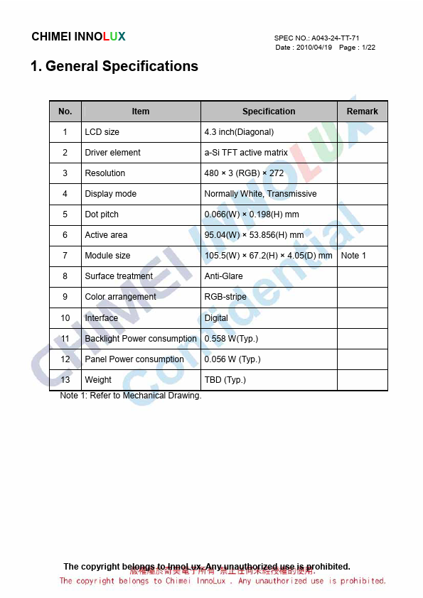 CHIMEI INNOLUX DISPLAY CORPORATION LCD MODULE S P E C I F I C AT I O N Customer: Any unauthorized use is prohibited. General Specifications SPEC NO.:.