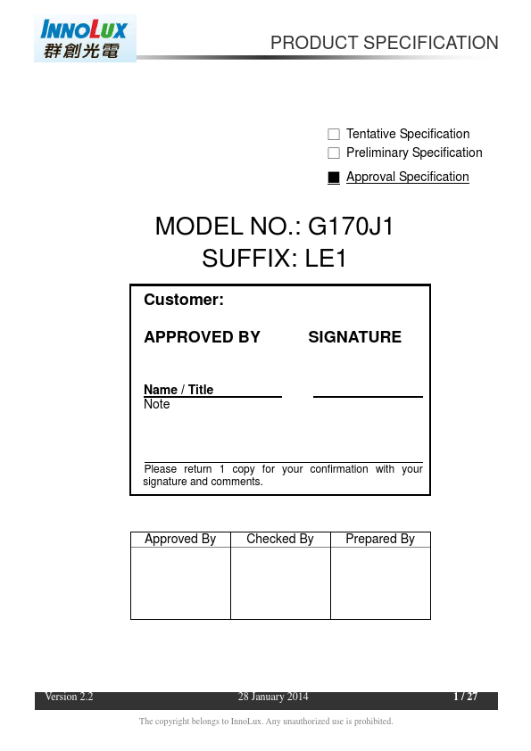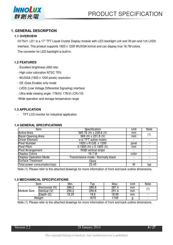 1.1 OVERVIEW G170J1- LE1 is a 17” TFT Liquid Crystal Display module with LED backlight unit and 30-pin-and-1ch LVDS interface. This product supports 1920 x 1200 WUXGA format and can display true 16.7M colors. The converter for LED backlight is built-in.