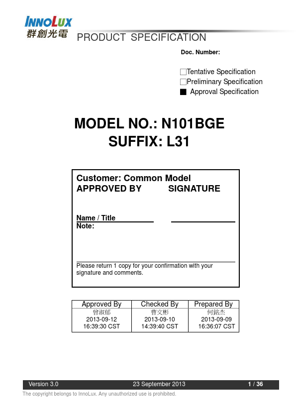 1.1 OVERVIEW N101BGE-L31 is a 10.1” (10.1” diagonal) TFT Liquid Crystal Display module with LED Backlight unit and 40 pins LVDS interface. This module supports 1366 x 768 HD mode and can display 262,144 colors. The optimum viewing angle is at 6 o’clock direction.