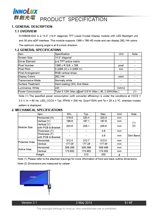 1.1 OVERVIEW N140BGE-E33 is a 14.0” (14.0” diagonal) TFT Liquid Crystal Display module with LED Backlight unit and 30 pins eDP interface. This module supports 1366 x 768 HD mode and can display 262,144 colors. The optimum viewing angle is at 6 o’clock direction.