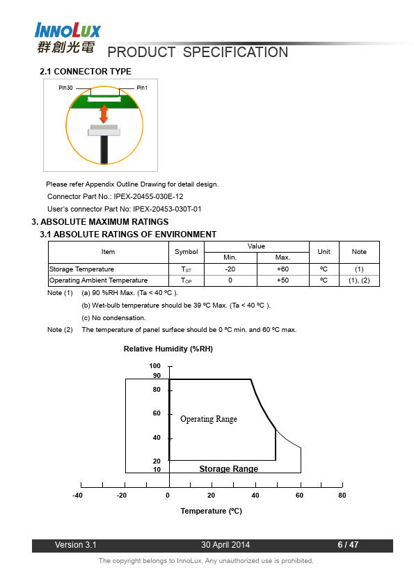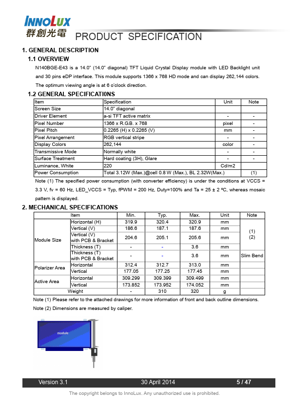 1.1 OVERVIEW N140BGE-E43 is a 14.0” (14.0” diagonal) TFT Liquid Crystal Display module with LED Backlight unit and 30 pins eDP interface. This module supports 1366 x 768 HD mode and can display 262,144 colors. The optimum viewing angle is at 6 o’clock direction.