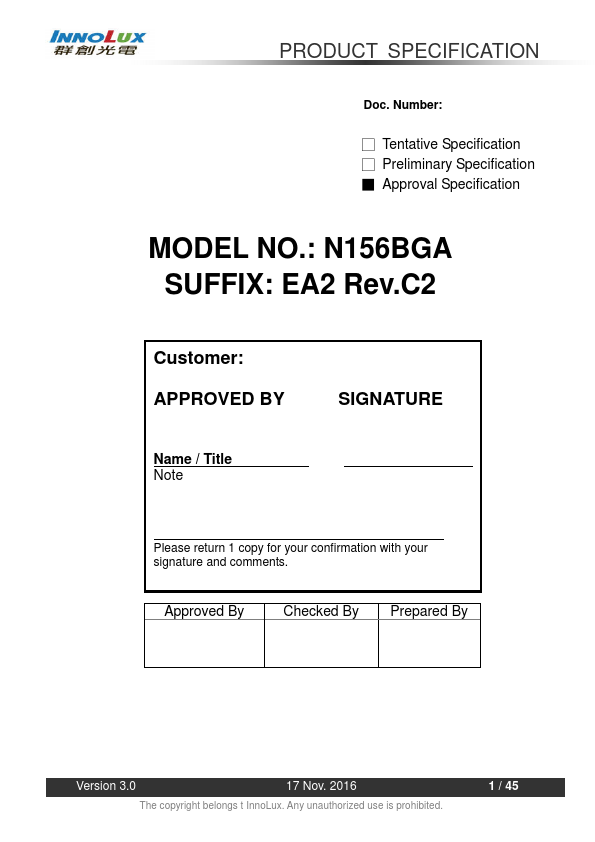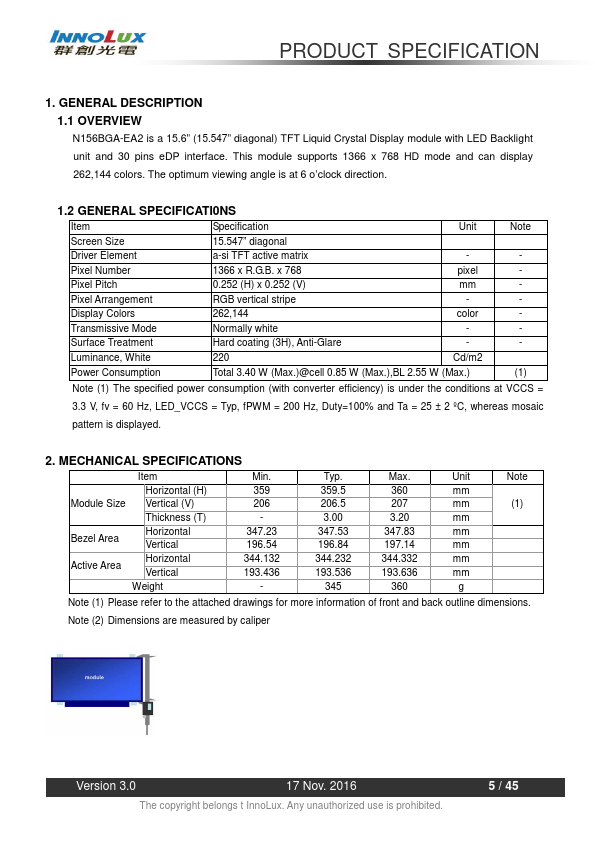 1.1 OVERVIEW N156BGA-EA2 is a 15.6” (15.547” diagonal) TFT Liquid Crystal Display module with LED Backlight unit and 30 pins eDP interface. This module supports 1366 x 768 HD mode and can display 262,144 colors. The optimum viewing angle is at 6 o’clock direction.