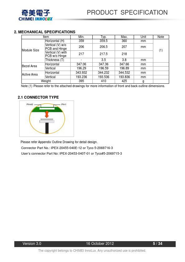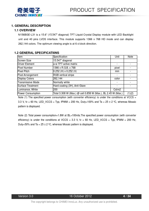 1.1 OVERVIEW N156BGE-L31 is a 15.6” (15.547” diagonal) TFT Liquid Crystal Display module with LED Backlight unit and 40 pins LVDS interface. This module supports 1366 x 768 HD mode and can display 262,144 colors. The optimum viewing angle is at 6 o’clock direction.