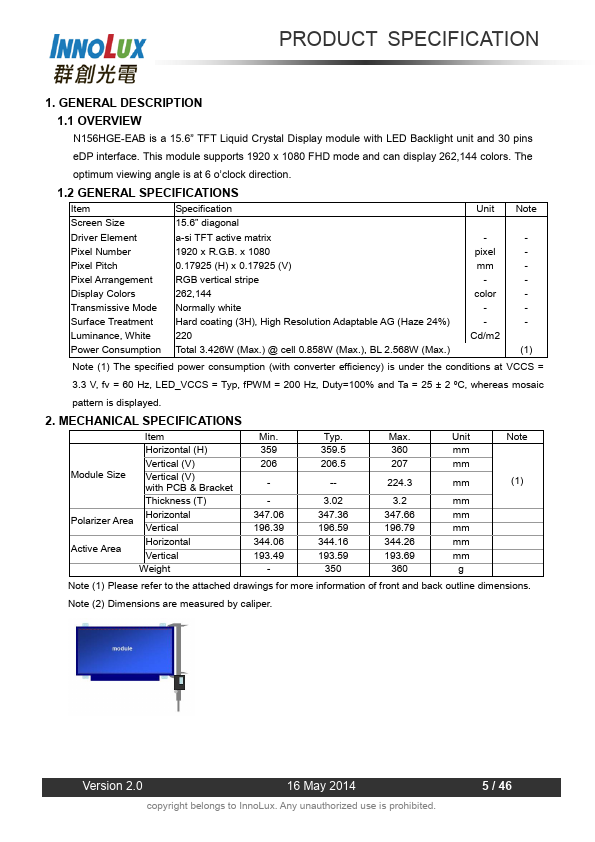 1.1 OVERVIEW N156HGE-EAB is a 15.6” TFT Liquid Crystal Display module with LED Backlight unit and 30 pins eDP interface. This module supports 1920 x 1080 FHD mode and can display 262,144 colors. The optimum viewing angle is at 6 o’clock direction.