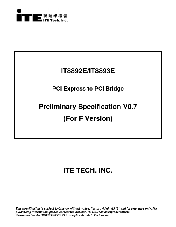- PCI - Compliant with PCI Local Bus Specification Revision 3.0 - Supports PCI 32-bit, 33/66 MHz, 3.3V, 5V tolerant - Supports 4(IT8892E) / 2(IT8893E) external REQ/GNT pairs for internal arbiter - Supports up to six queues for memory read cycles - Supports up to 24 outstanding memory read cycles