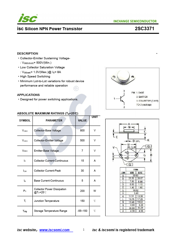 Collector-Emiiter Sustaining Voltage- : VCEO(SUS)= 500V(Min.) - Low Collector Saturation Voltage : VCE(sat)= 1.0V(Max.)@ IC= 8A - High Speed Switching - Minimum Lot-to-Lot variations for robust device performance and reliable operation.