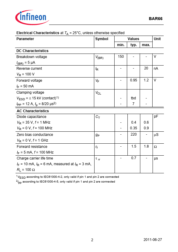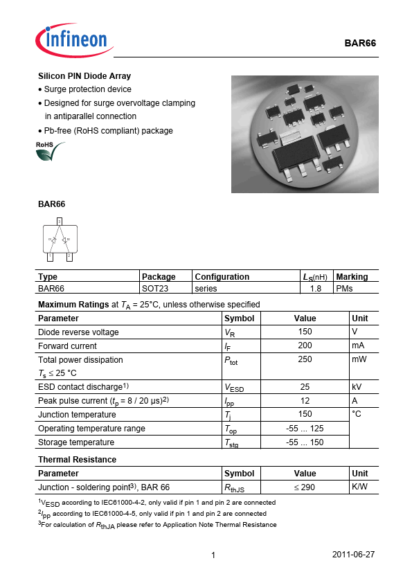 Silicon PIN Diode Array Surge protection device Designed for surge overvoltage clamping in antiparallel connection Pb-free (RoHS pliant) package BAR66 BAR66 ! 125 Storage temperature Tstg -55 ...