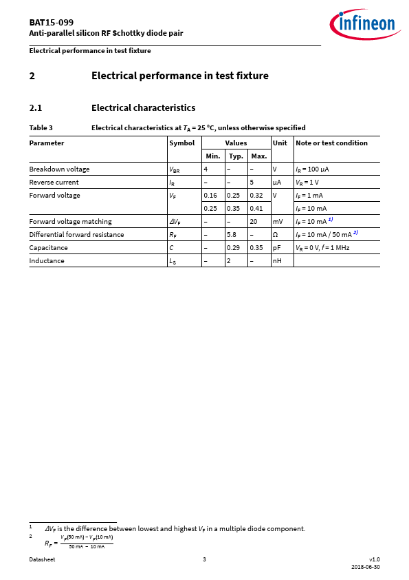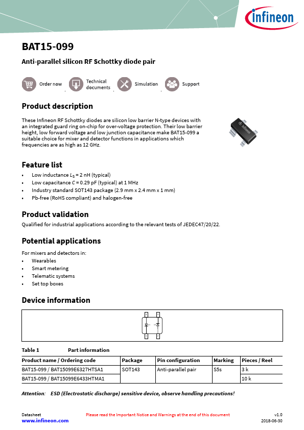 These Infineon RF Schottky diodes are silicon low barrier N-type devices with an integrated guard ring on-chip for over-voltage protection. Their low barrier height, low forward voltage and low junction capacitance make BAT15-099 a suitable choice for mixer and detector functions in applications which frequencies are as high as 12 GHz.