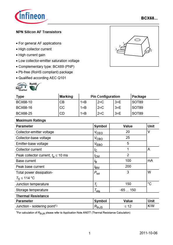 Overview: NPN Silicon AF Transistors • For general AF applications • High collector current • High current gain • Low collector-emitter saturation voltage • Complementary type: BCX69 (PNP) • Pb-free (RoHS.