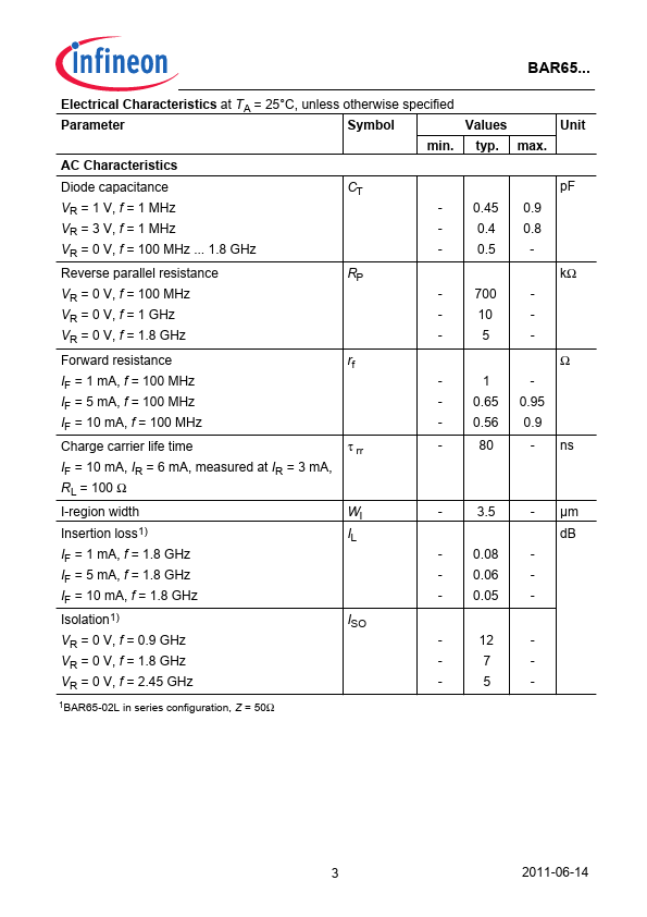 Silicon PIN Diode Series diode for mobile munication in low loss transmit-receiver switches Band switch for TV-tuners Very low forward resistance (typ. 0.65 Ω @ 5 mA) Low capacitance (typ. 0.5 pF @ 0V) Fast switching applications Pb-free (RoHS pliant) package BAR65...
