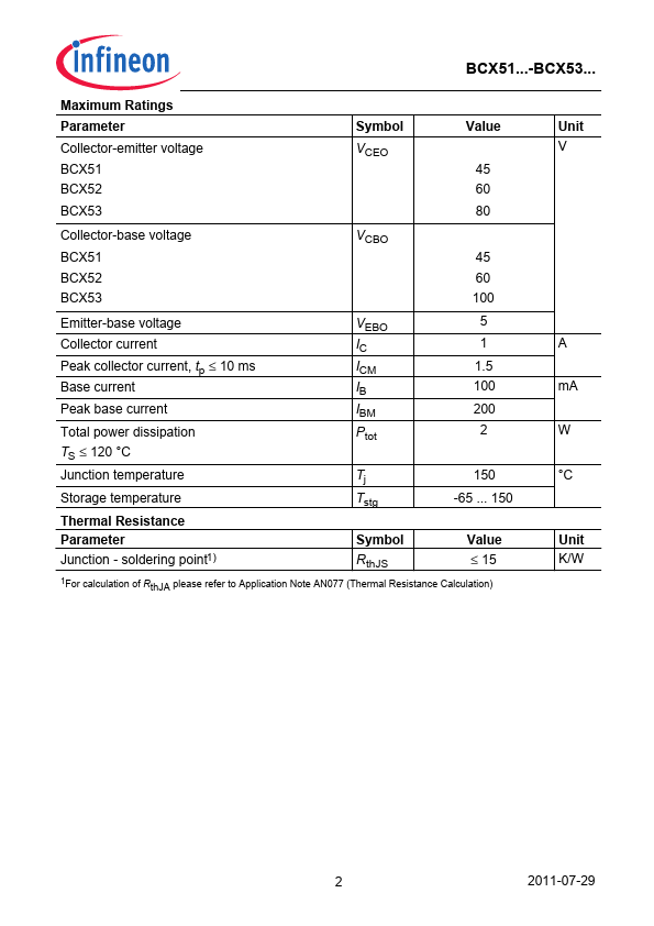Note: The manufacturer provides a single datasheet file (BCX51_InfineonTechnologiesAG.pdf) that lists specifications for multiple related part numbers.