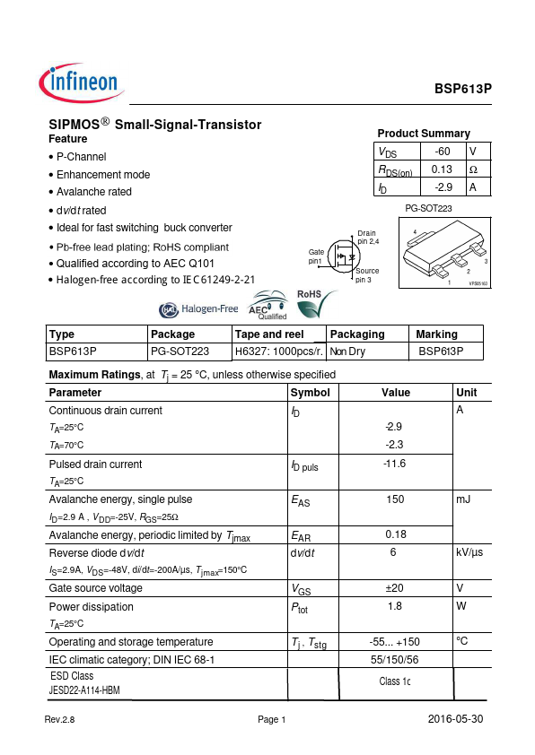 Feature • P-Channel • Enhancement mode • Avalanche rated • dv/dt rated • Ideal for fast switching buck converter
