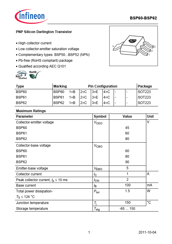 Download the BSP62 datasheet PDF. This datasheet also covers the BSP60 variant, as both devices belong to the same pnp silicon darlington transistor family and are provided as variant models within a single manufacturer datasheet.