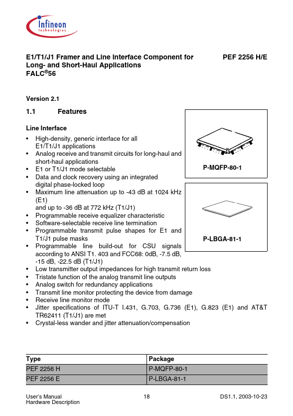 Common master clock reference for E1 and T1/J1 (any frequency within 1.02 and 20 MHz) Power-down function Support of automatic protection switching Dual-rail or single-rail digital inputs and outputs Unipolar NRZ or CMI for interfacing fiber-optical transmission routes Selectable line codes (E1: HDB3, AMI/T1: B8ZS, AMI with ZCS) Loss-of-signal indication with programmable thresholds according to ITU-T G.775, ETS300233 (E1) and ANSI T1.403 (T1/J1) Optional data stream muting upon LOS detection Programmable receive slicer threshold.