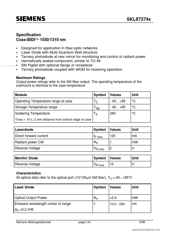 Characteristics All optical data refer to the optical port (10/125µm SM fiber), TC =-40...+85°C