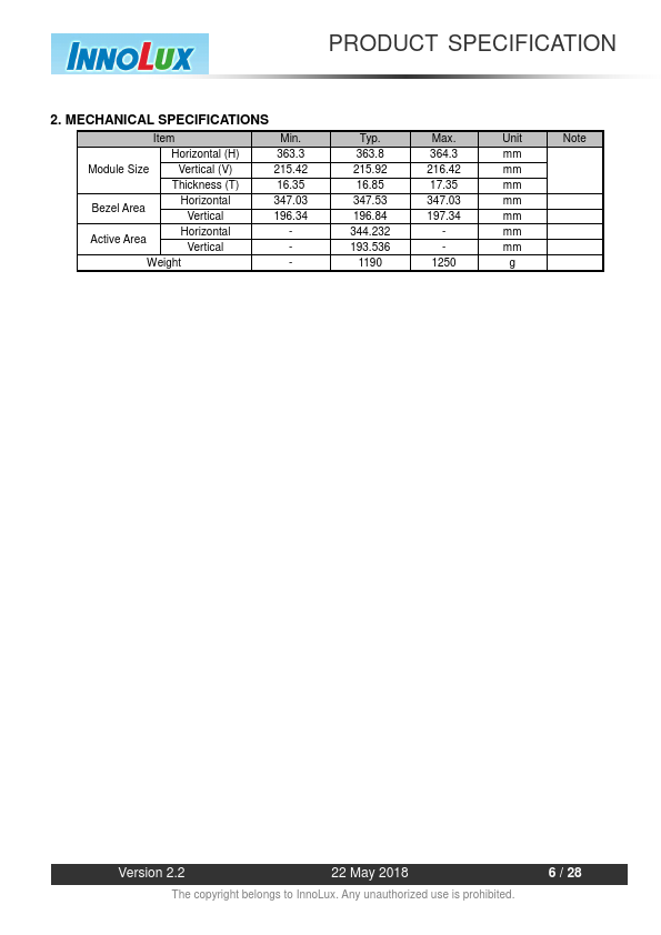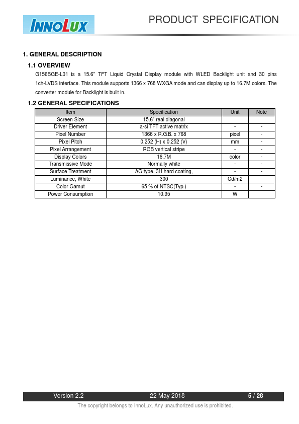 1.1 OVERVIEW G156BGE-L01 is a 15.6” TFT Liquid Crystal Display module with WLED Backlight unit and 30 pins 1ch-LVDS interface. This module supports 1366 x 768 WXGA mode and can display up to 16.7M colors. The converter module for Backlight is built in.
