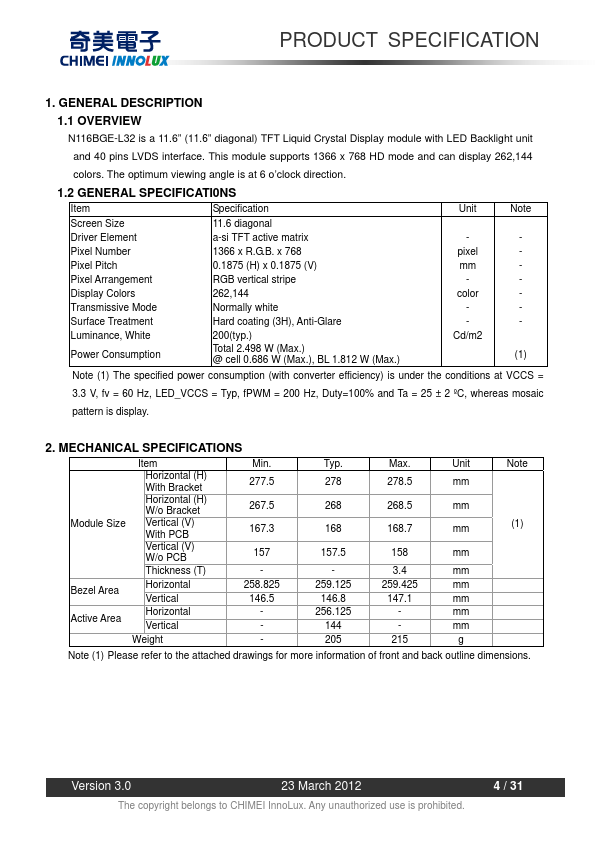 1.1 OVERVIEW N116BGE-L32 is a 11.6” (11.6” diagonal) TFT Liquid Crystal Display module with LED Backlight unit and 40 pins LVDS interface. This module supports 1366 x 768 HD mode and can display 262,144 colors. The optimum viewing angle is at 6 o’clock direction.