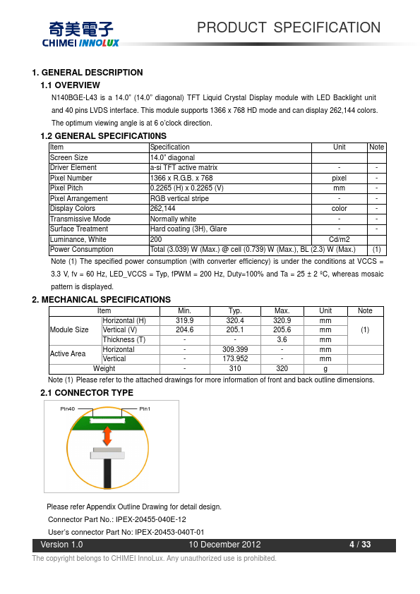 1.1 OVERVIEW N140BGE-L43 is a 14.0” (14.0” diagonal) TFT Liquid Crystal Display module with LED Backlight unit and 40 pins LVDS interface. This module supports 1366 x 768 HD mode and can display 262,144 colors. The optimum viewing angle is at 6 o’clock direction.