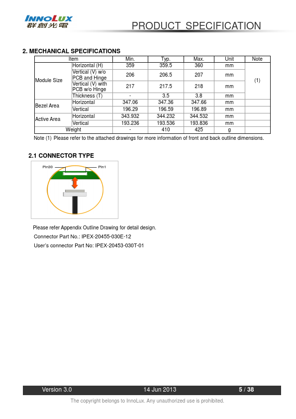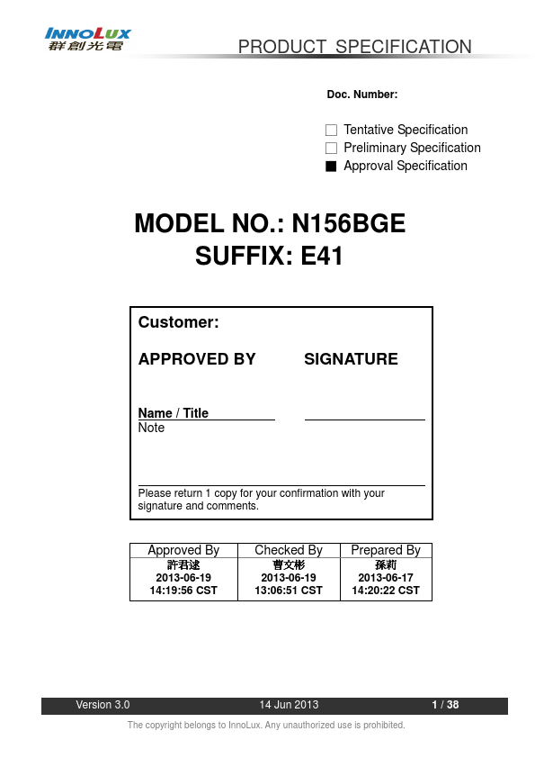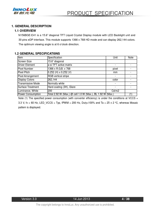 1.1 OVERVIEW N156BGE-E41 is a 15.6” diagonal TFT Liquid Crystal Display module with LED Backlight unit and 30 pins eDP interface. This module supports 1366 x 768 HD mode and can display 262,144 colors. The optimum viewing angle is at 6 o’clock direction.