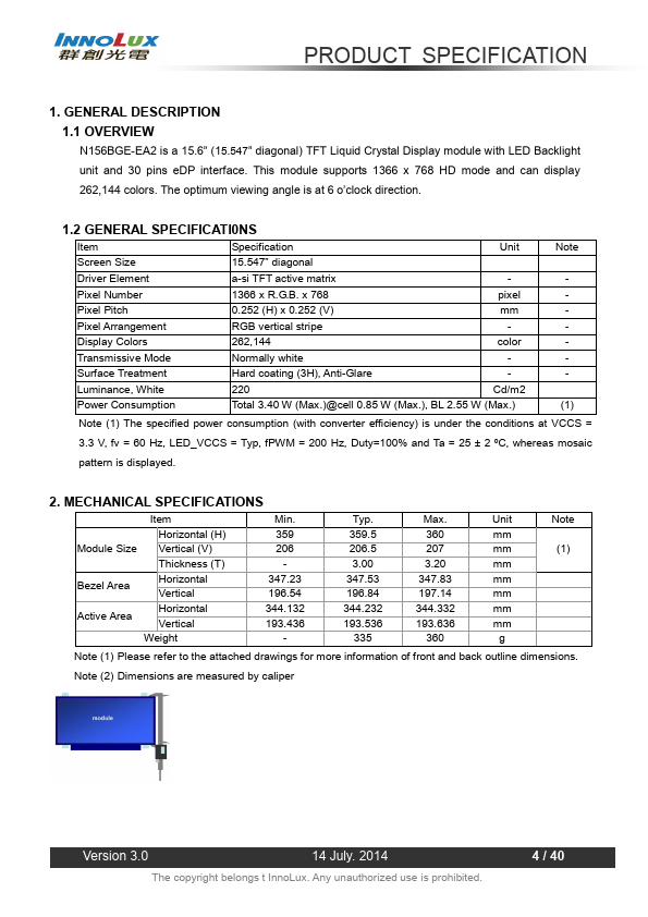 1.1 OVERVIEW N156BGE-EA2 is a 15.6” (15.547” diagonal) TFT Liquid Crystal Display module with LED Backlight unit and 30 pins eDP interface. This module supports 1366 x 768 HD mode and can display 262,144 colors. The optimum viewing angle is at 6 o’clock direction.