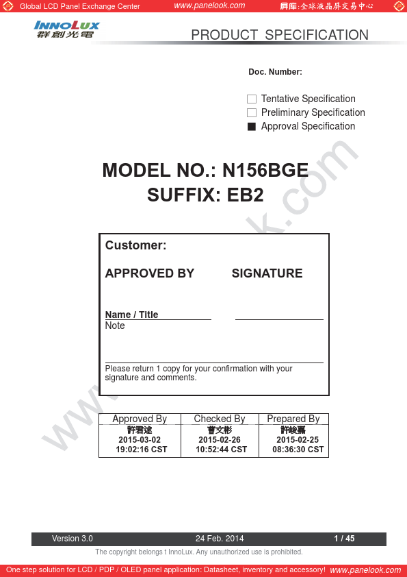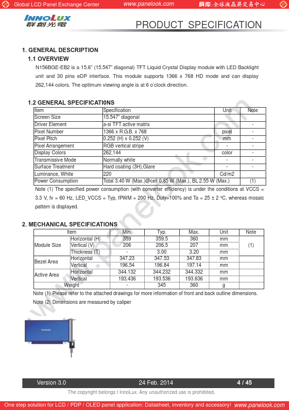 1.1 OVERVIEW N156BGE-EB2 is a 15.6” (15.547” diagonal) TFT Liquid Crystal Display module with LED Backlight unit and 30 pins eDP interface. This module supports 1366 x 768 HD mode and can display 262,144 colors. The optimum viewing angle is at 6 o’clock direction.