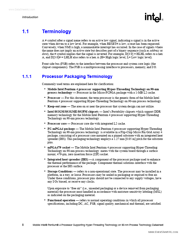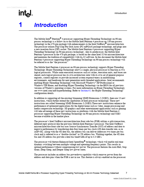 Mobile Intel® Pentium® 4 Processor Supporting Hyper-Threading Technology on 90-nm Process Technology Datasheet January 2005 Document Number: 1 Introduction Introduction The Mobile Intel® Pentium® 4 processor supporting Hyper-Threading Technology on 90-nm process technology is a follow on to the Mobile Intel Pentium 4 processor on 130-nm process technology in the 478-pin package with enhancements to the Intel...