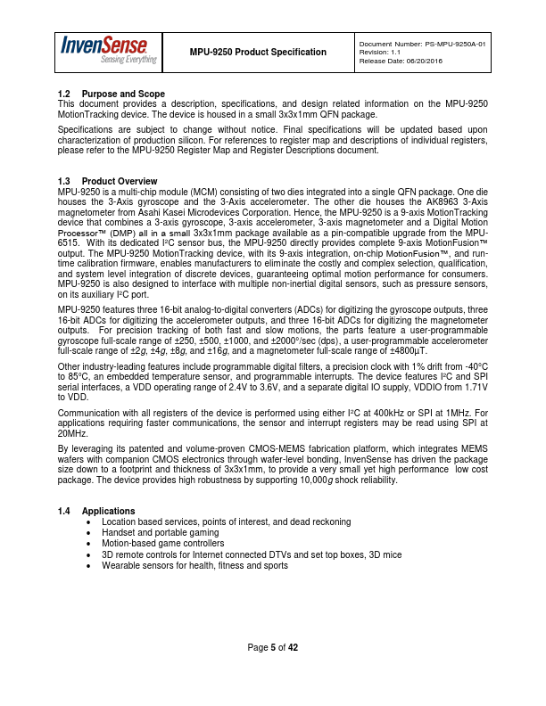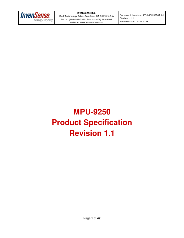 , specifications, and design related information on the MPU-9250 MotionTracking device. The device is housed in a small 3x3x1mm QFN package. Specifications are subject to change without notice.