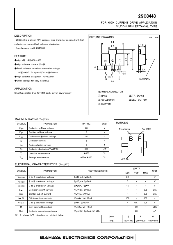 High hFE hFE=150~800 High collector current IC=2A Small collector to emitter saturation vo| Part number | 2SC3443 |