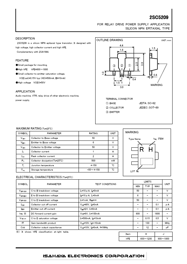2SC5209 FOR RELAY DRIVE POWER SUPPLY APPLICATION SILICON NPN EPITAXIAL TYPE DESCRIPTION 2SC5209 is a silicon NPN epitaxial type transistor. It designed with high voltage,...