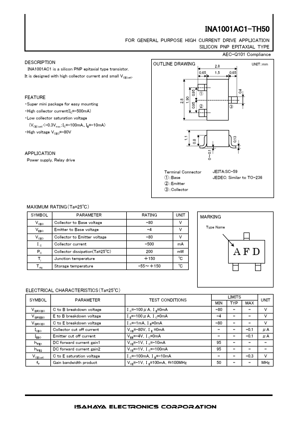 Overview: INA1001AC1-TH50 FOR GENERAL PURPOSE HIGH CURRENT DRIVE APPLICATION SILICON PNP EPITAXIAL TYPE AEC-Q101.
