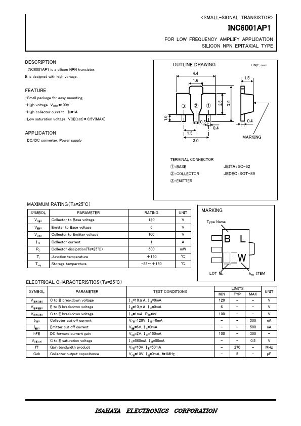 | INC1001AC1 | SILICON NPN EPITAXIAL TYPE TRANSISTOR |