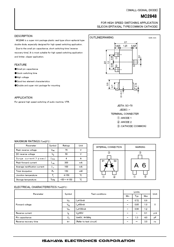MC2848 is a super mini package plastic seal type silicon epitaxial type double diode, especially designed for high speed switching application. Due to the small pin capacitance, short switching time (reverse recovery time), It is most suitable for high speed switching application and limiter, clipper application.