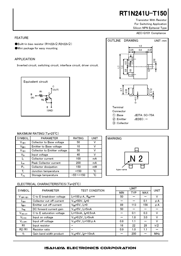 FEATURE ●Built-in bias resistor (R1=22kΩ,R2=22kΩ) ●Mini package for easy mounting APPLICATION Inverted circuit, switching circuit, interface circuit, driver circuit.