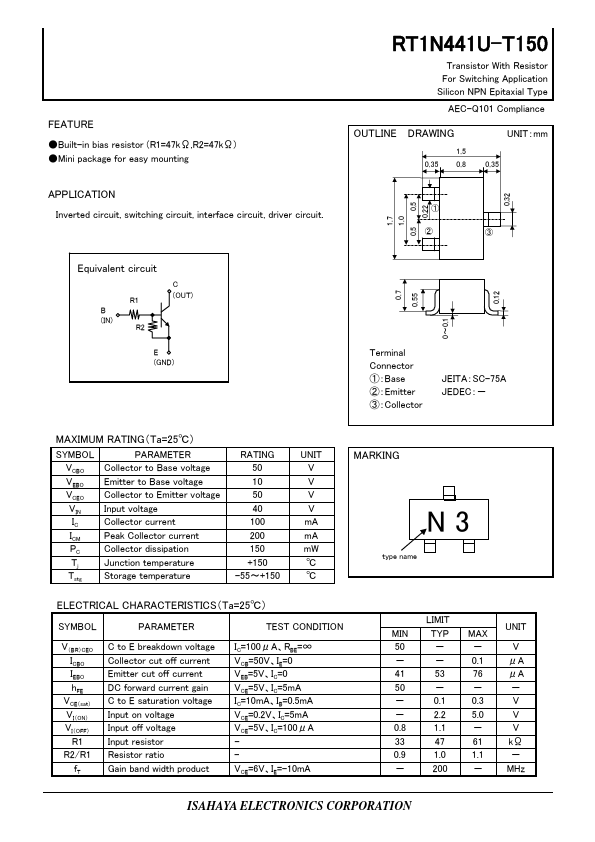 Overview: FEATURE ●Built-in bias resistor (R1=47kΩ,R2=47kΩ) ●Mini package for easy mounting APPLICATION Inverted circuit, switching circuit, interface circuit, driver circuit.