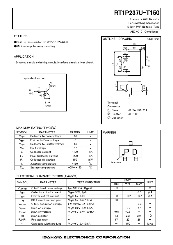 FEATURE Built-in bias resistor (R1=2.2kΩ,R2=47kΩ) Mini package for easy mounting APPLICATION Inverted circuit, switching circuit, interface circuit, driver circuit. ·ISAHAYA Electronics Corporation puts the maximum effort into making semiconductor products better and more reliable, but there is always the possibility that trouble may occur with them. Trouble with semiconductors may lead to personal injury, fire or...