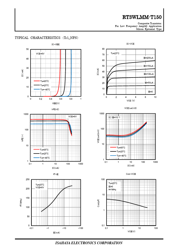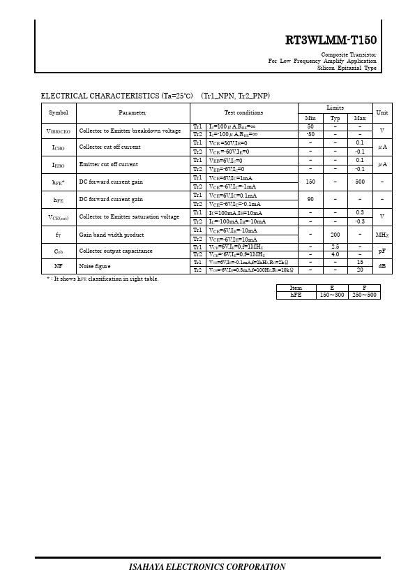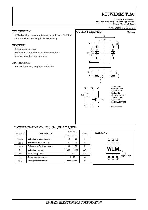 RT3WLMM is pound transistor built with 2SC3052 chip and ISA1235A chip in SC-88 package. posite Transistor For Low Frequency Amplify Application Silicon Epitaxial Type AEC-Q101 pliance OUTLINE DRAWING Unit:mm 2.1 1.25 0.24.
