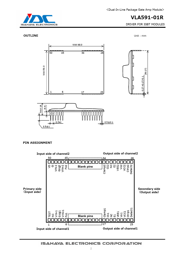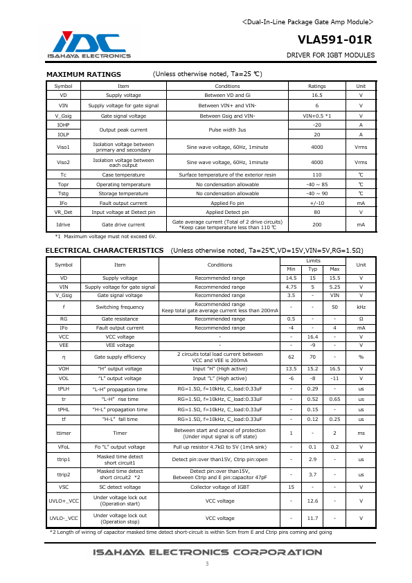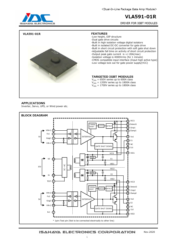 -Low height, DIP structure -Dual gate drive circuits -Built in high isolation voltage digital isolators -Built in isolated DC-DC converter for gate drive -Built in short circuit protection with soft gate shut down -Adjustable fall time on activity of short circuit protection -Output peak gate current is +/-20A(max) -Isolation voltage is 4000Vrms (for 1 minute) -CMOS compatible input interface (Input high active type) -Low voltage lock out for gate power supply(VCC)
