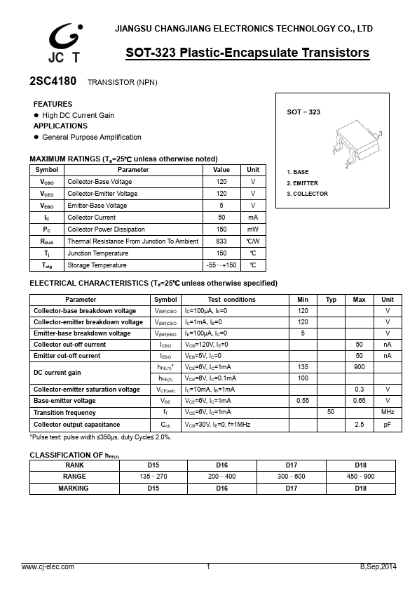 JIANGSU CHANGJIANG ELECTRONICS TECHNOLOGY CO., LTD JC(T SOT-323 Plastic-Encapsulate Transistors 2SC4180 TRANSISTOR (NPN) FEATURES High DC Current Gain APPLICATIONS Ge...