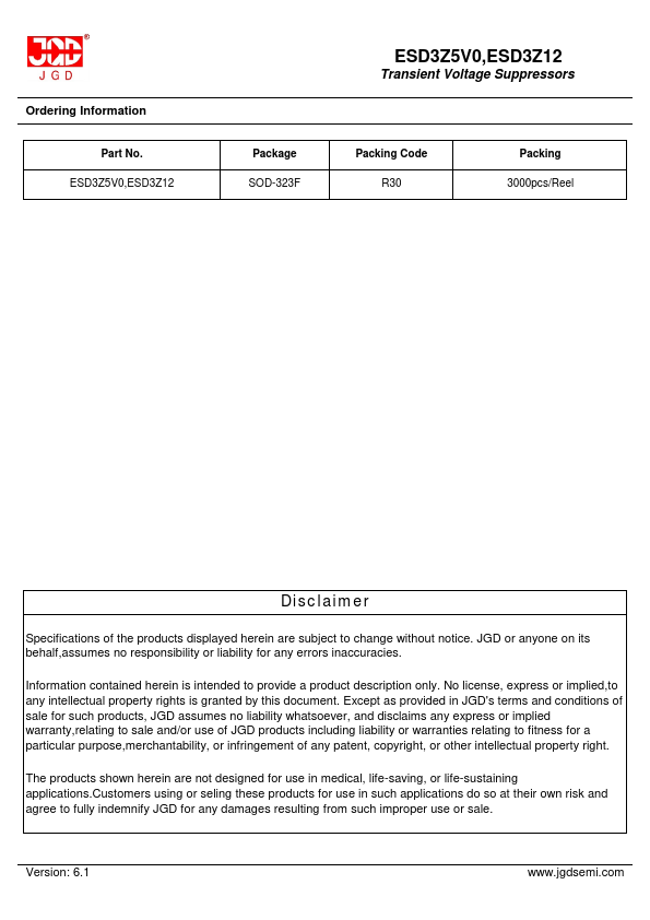 No license, express or implied,to any intellectual property rights is granted by this document. Except as provided in JGD's terms and conditions of sale for such products, JGD assumes no liability whatsoever, and disclaims any express or implied warranty,relating to sale and/or use of JGD products including liability or warranties relating to fitness for a particular purpose,merchantability, or infringement of any...
