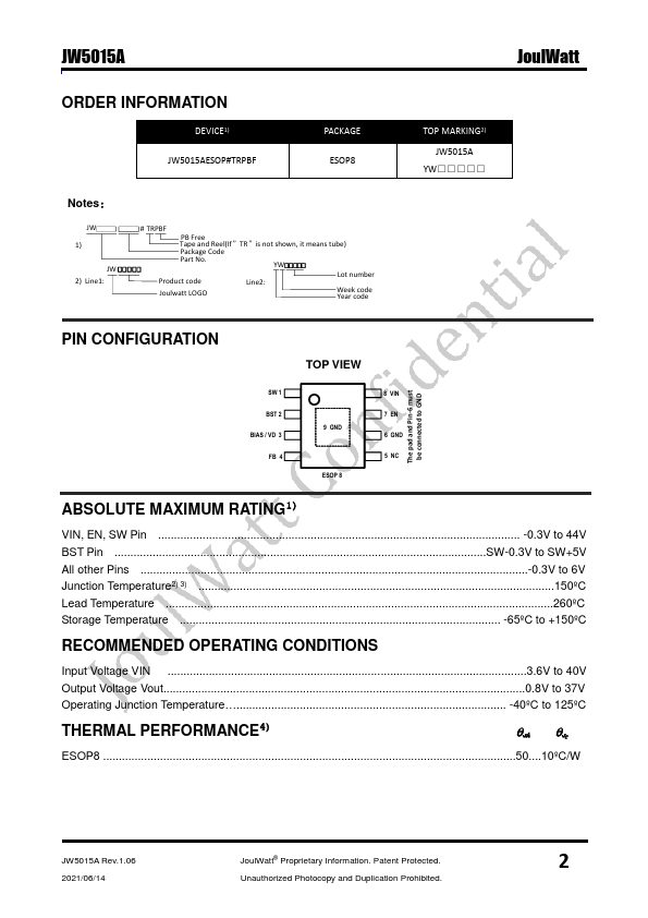 Operating with an input range of 3.6V~40V, the JW5015A delivers 2A of continuous output current with two integrated N-Channel MOSFETs.