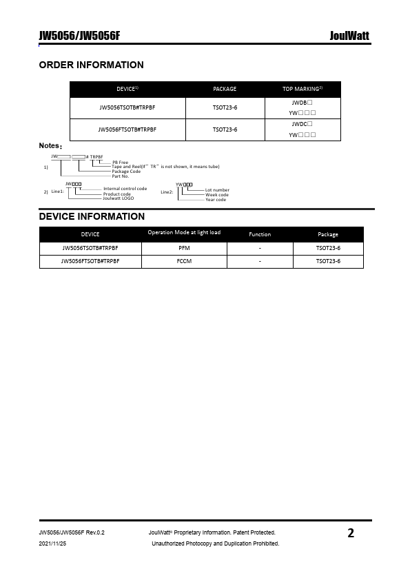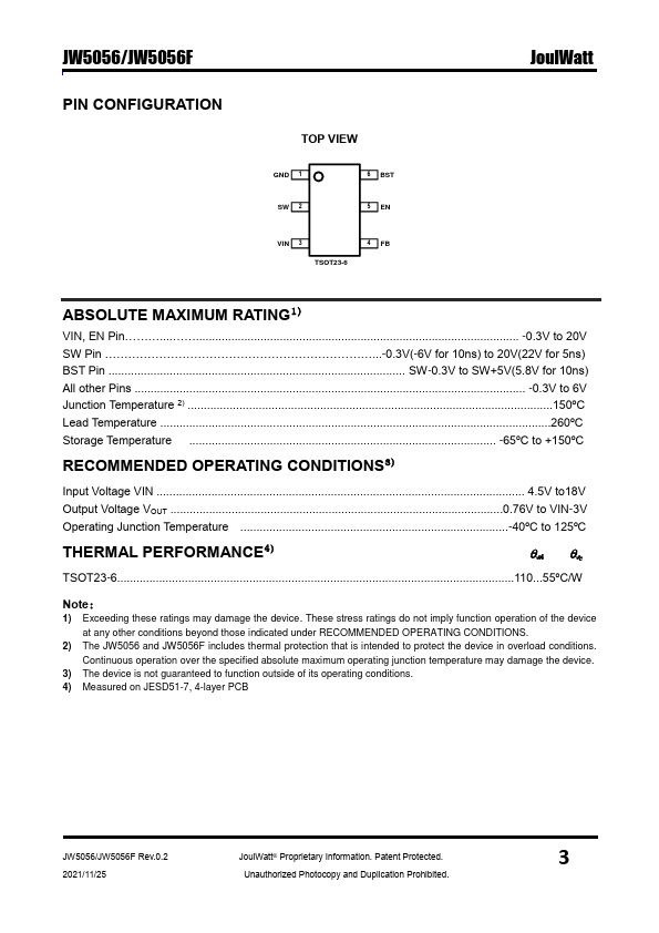 Operating with an input range of 4.5V~18V, JW5056 and JW5056F deliver 5A of continuous output current with two integrated N-Channel MOSFETs.